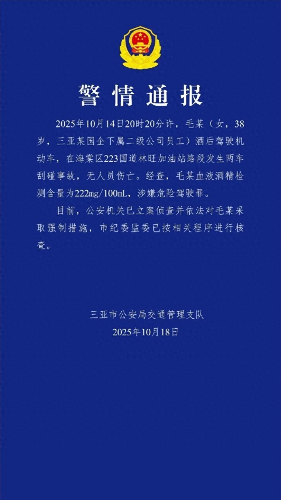 此前报道:三亚一女子酒后倒车撞劳斯莱斯,扬言“我是国企的,让市委市政府通报我”,交警酒精检测时女子比剪刀手近日,海南三亚一女子酒后倒车撞到一辆劳斯莱斯。女子情绪激动,自称国企员工,不配合交警开展呼气式酒精检测,扬言让市委市政府通报她的违法行为。经现场检测,女子涉嫌酒驾。