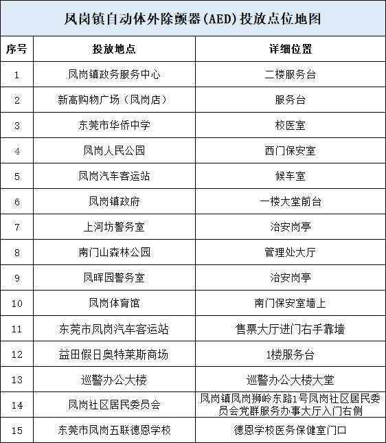 截至目前,凤岗镇公共服务办已在体育馆、商场、公园、学校等重点区域完成10台AED的投放。此外,东莞市卫生健康局也分批次支援镇街急救能力建设,已在凤岗社区居委会、五联德恩学校等地增设5台设备,第三批投放计划正稳步推进。