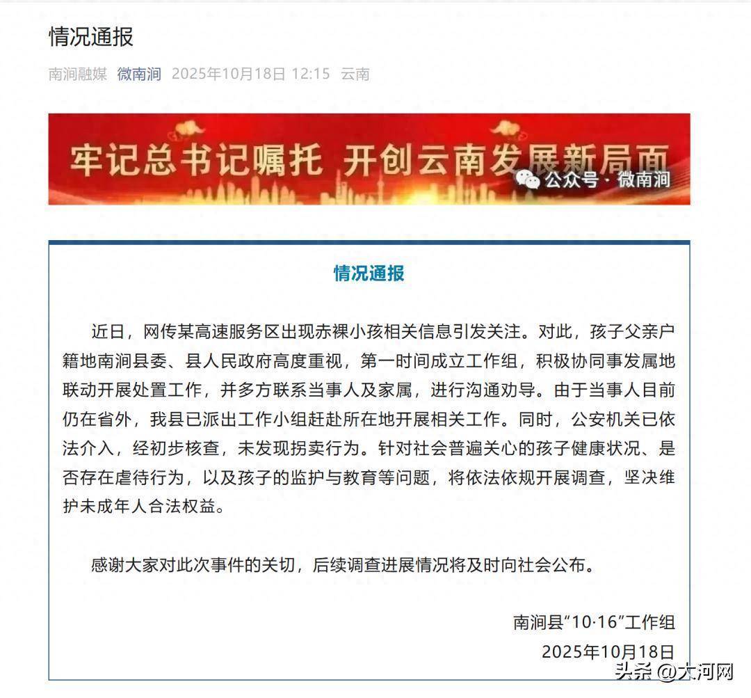 10月18日,云南南涧县“10·16”工作组针对“高速服务区现赤裸小孩”发布情况通报,全文如下: