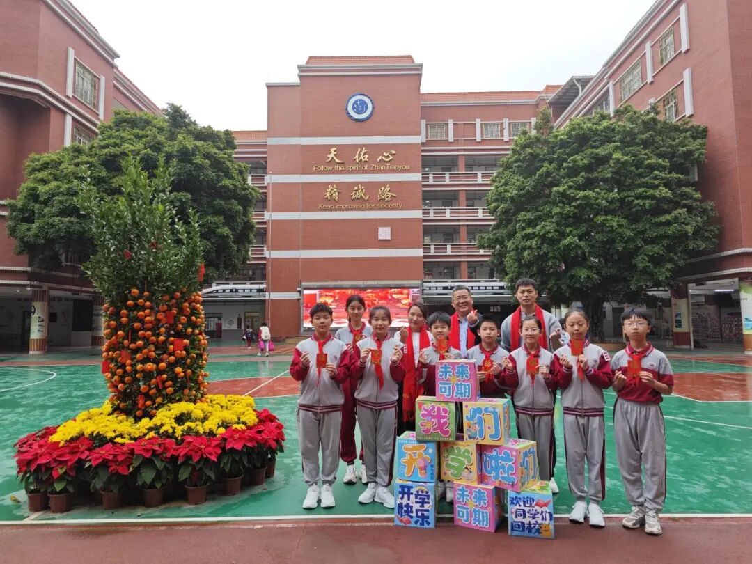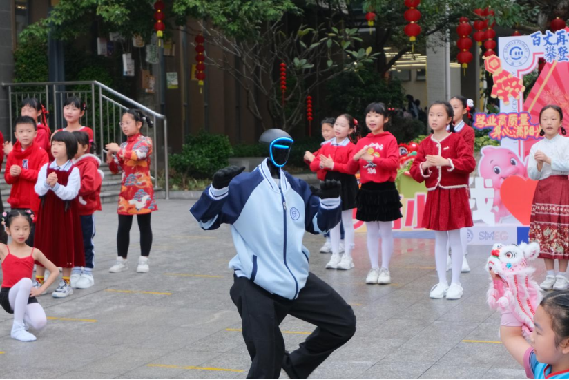 同学们说出新春贺年词,领取满载新春祝福的开学红包与摸八物、执八福,开启新学期的旅程。同时,身穿沙面小学校服的机器人表演炫酷亮相,动作灵活、科技感十足,展现新时代校园的创新活力。