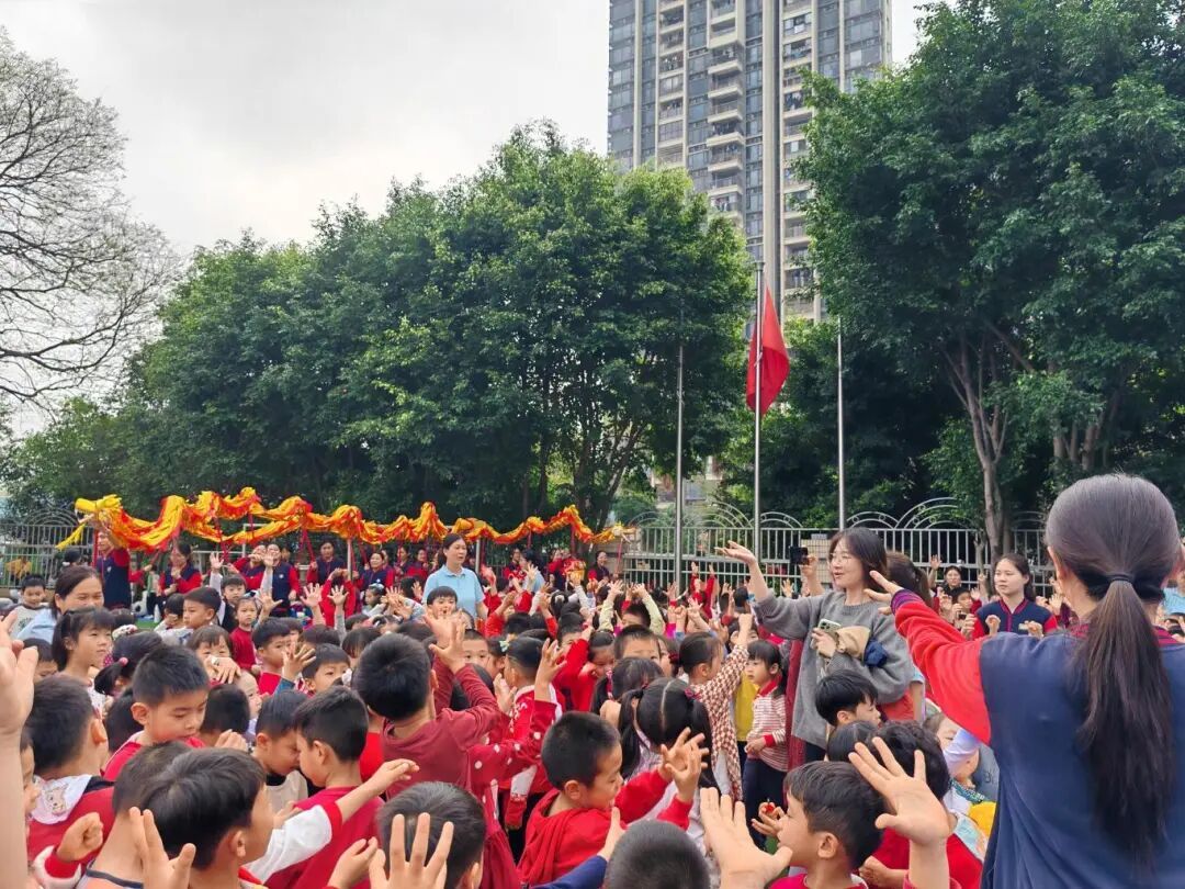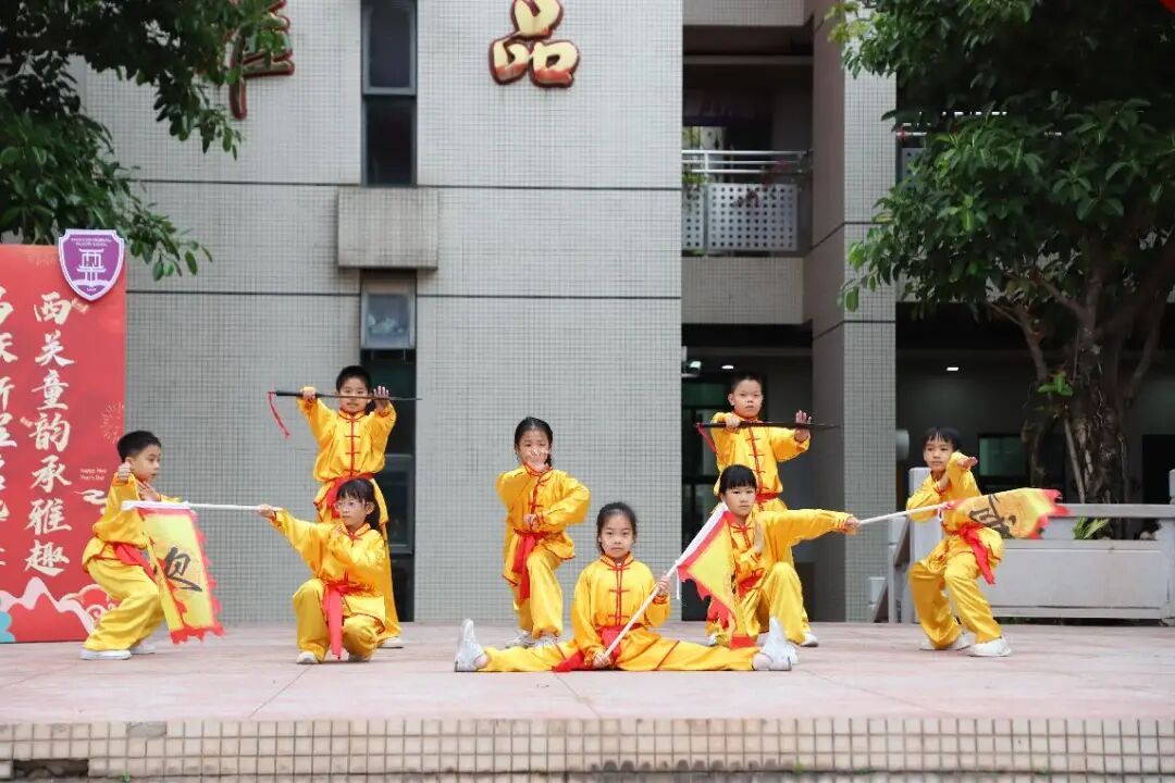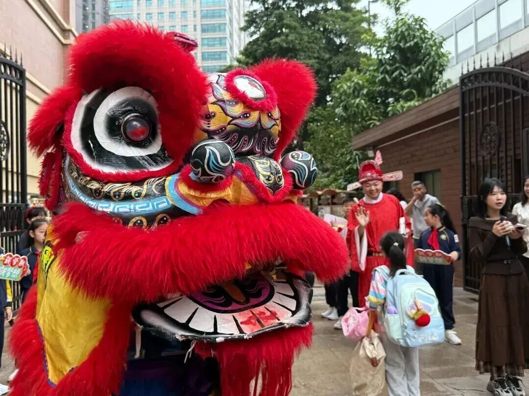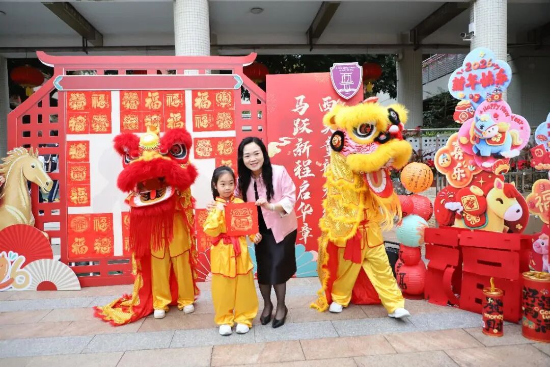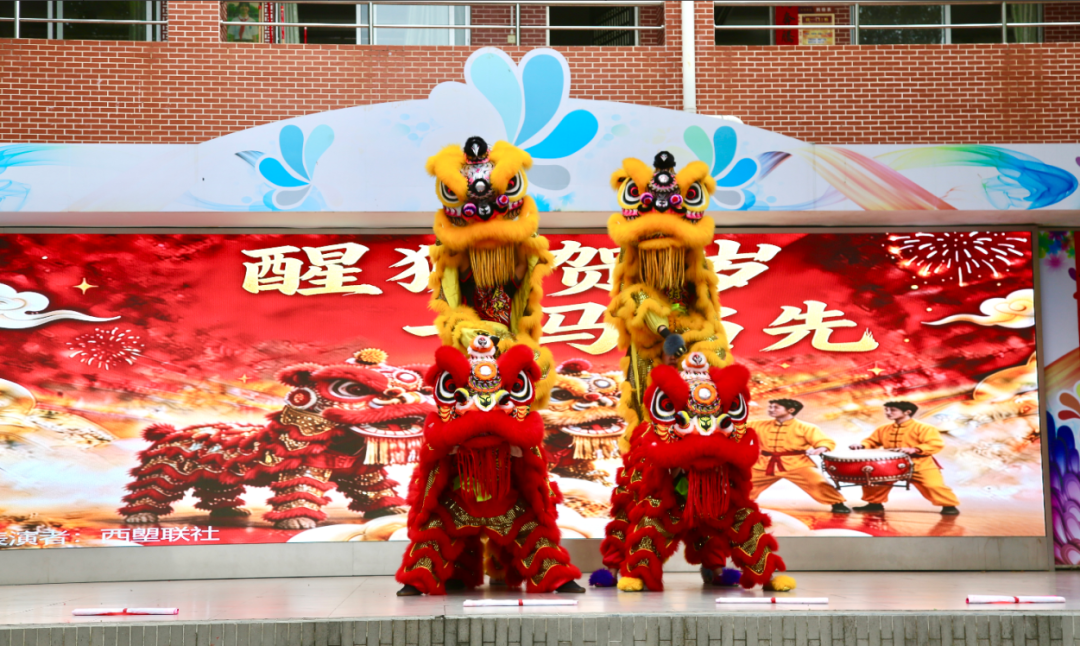 身穿“文曲星”造型迎春装的老师祝愿学子学业精进、前程似锦。醒狮队伴随着铿锵有力的锣鼓声腾跃舞动,为师生送上最真挚的新春祝福。