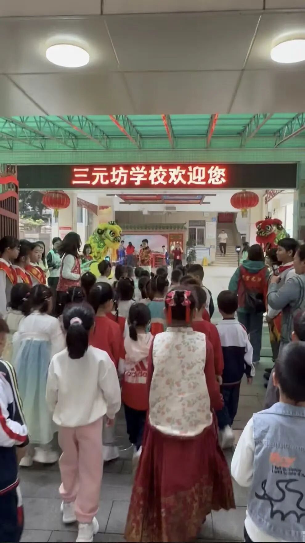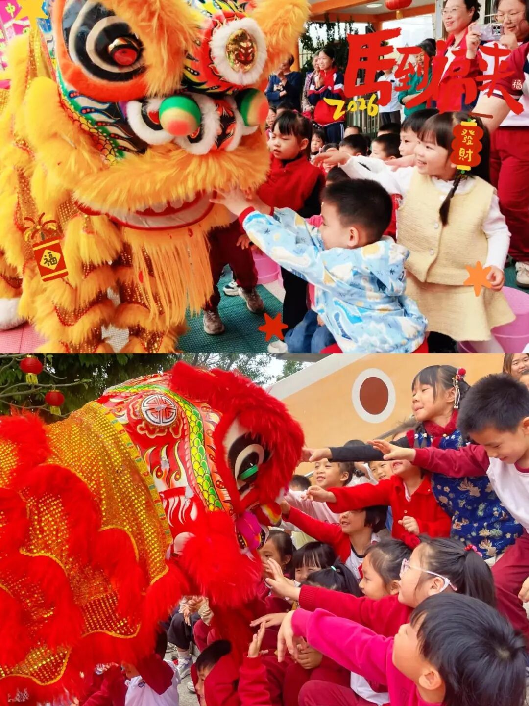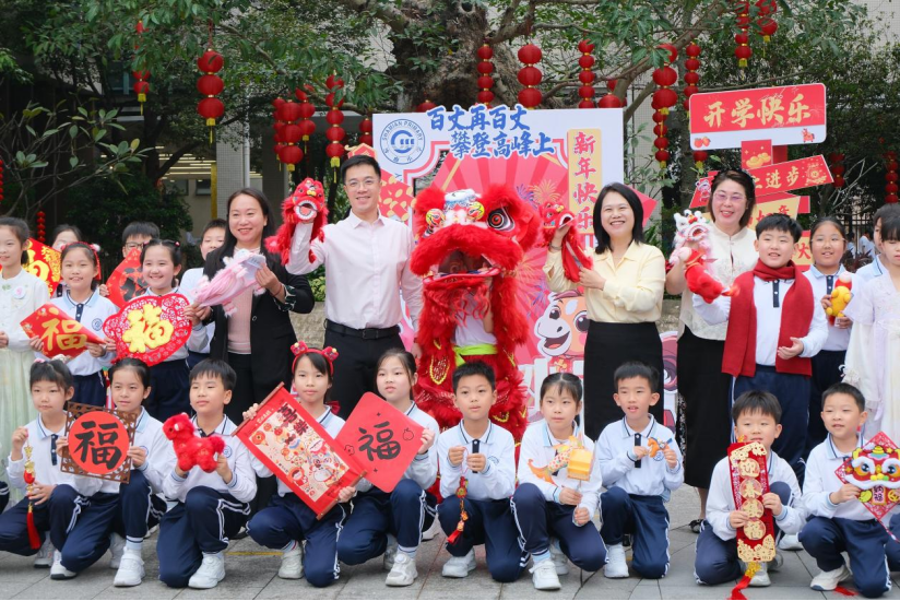 开学现场锣鼓喧天,醒狮翻腾送福,师生伸手摸狮头、接福气,祈愿新学期平安顺遂;学生手提花灯,唱响粤语金曲《迎春花》,元宵喜庆氛围浓郁。