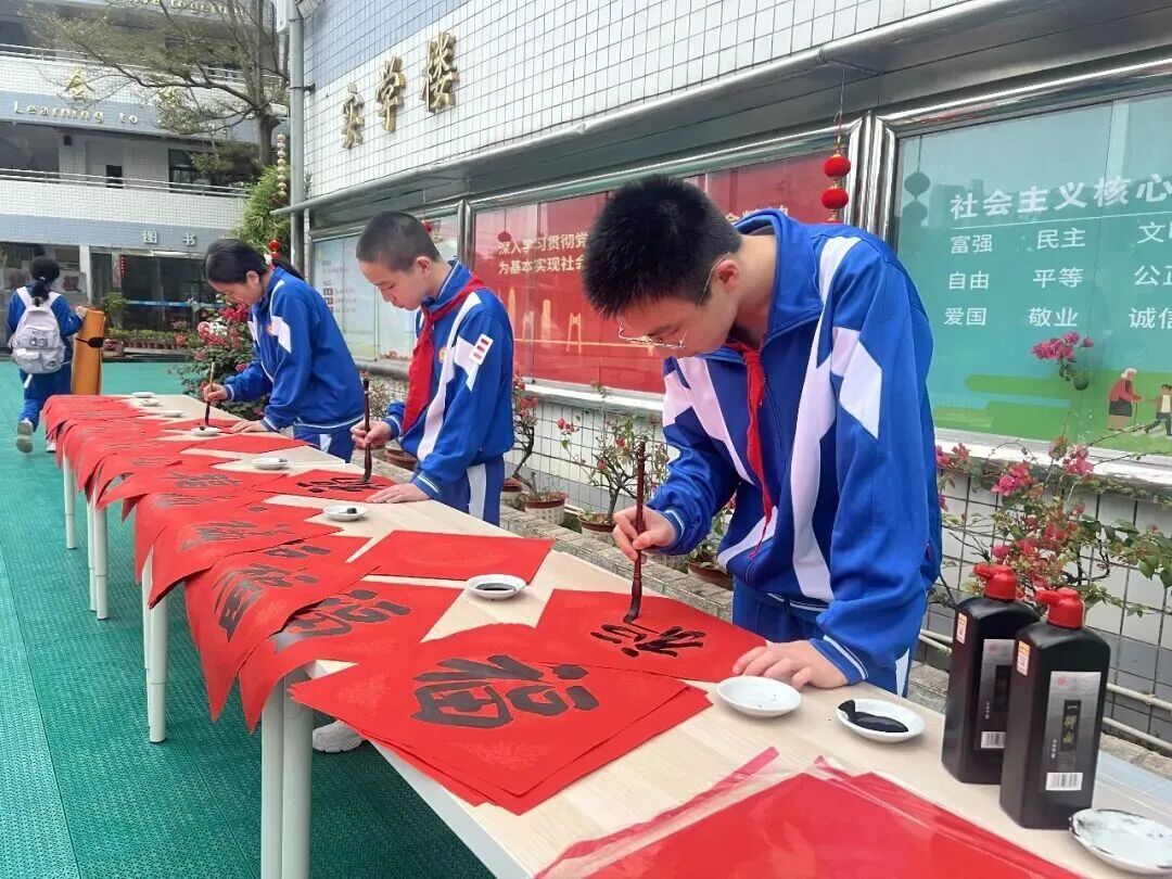 学子们在校道宣传栏旁挥毫泼墨,书写“福”字。校领导们暖心地为师生们送上书写的“福”字,传递新春期许,寓意着新的一年福气满满,马到成功。