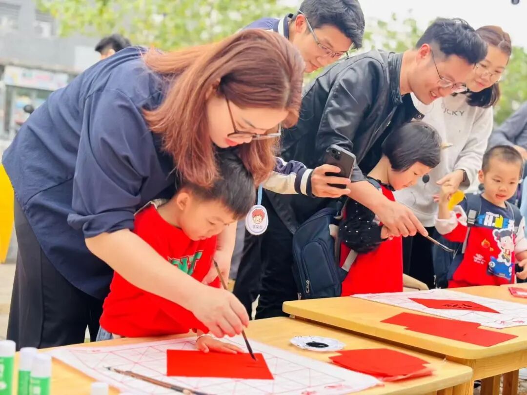孩子和家长们执笔挥墨,在红纸上写下一个个“福”字,寓意新春的吉兆;长桌上摆满寓意吉祥的蔬果——摸摸橘子,大吉大利;碰碰番茄,红红火火。