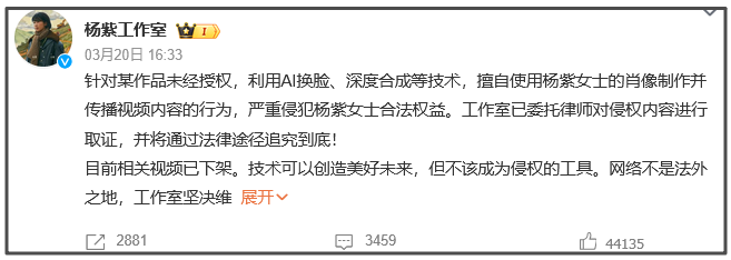 针对某作品未经授权,利用AI换脸、深度合成等技术,擅自使用杨紫女士的肖像制作并传播视频内容的行为,严重侵犯杨紫女士合法权益。工作室已委托律师对侵权内容进行取证,并将通过法律途径追究到底!