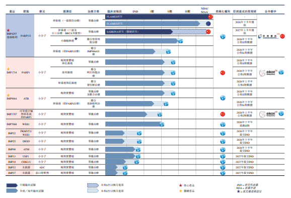 英派药业的研发管线是中国乃至全球范围内最全面、最先进的合成致死药物组合之一,具备同类最佳潜力。截至最后实际可行日期,公司的研发管线包含1款商业化阶段药物、4款临床阶段药物、7款IND前阶段药物,包括覆盖PARP1/2、PARP1、ATR、WEE1、PKMYT1/WEE1、DHX9、ATM、USP1及CHK1/2等关键合成致死靶点的小分子抑制剂,以及新一代ADC及蛋白降解剂候选药物等新兴疗法。