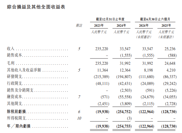 招股书显示,在过去的2023年、2024年和2025年前六个月,英派药业的营业收入分别为人民币2.35亿、0.3355亿和0.2524亿元,相应的研发开支分别为人民币2.15亿、1.95亿和0.8634亿元,相应的净亏损分别为人民币0.1994亿、2.55亿和1.29亿元。